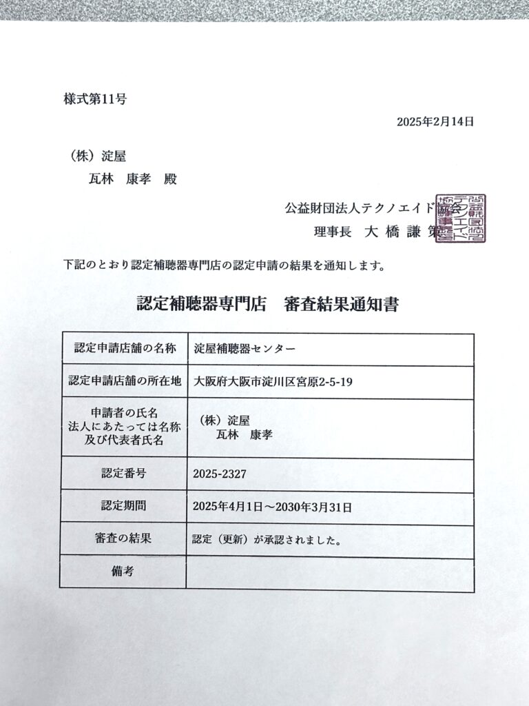 昨年から申請していました。認定補聴器専門店。これはテクノエイド協会が認定する補聴器販売店の中でも設備、管理体制が一定水準に達している場合のみ認められる制度です。認定をもらうには申請をしいろいろな書類を提出し、その後わざわざ審査官が店にやってきて申請通りの設備、管理が行き届いているかをチェックします。認められてからも5年に一度はチェックが入り、基準を満たしていないと更新できない厳しさです。