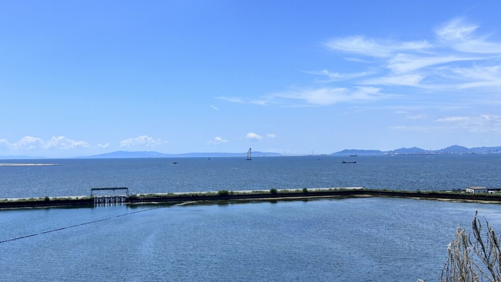 会場全体が見渡せます。右端の高いビルはATC。正面の遠くにあのゴミ焼却場の塔も見えます。下(右)の写真の陸地の切れ目には明石海峡大橋も見えました。