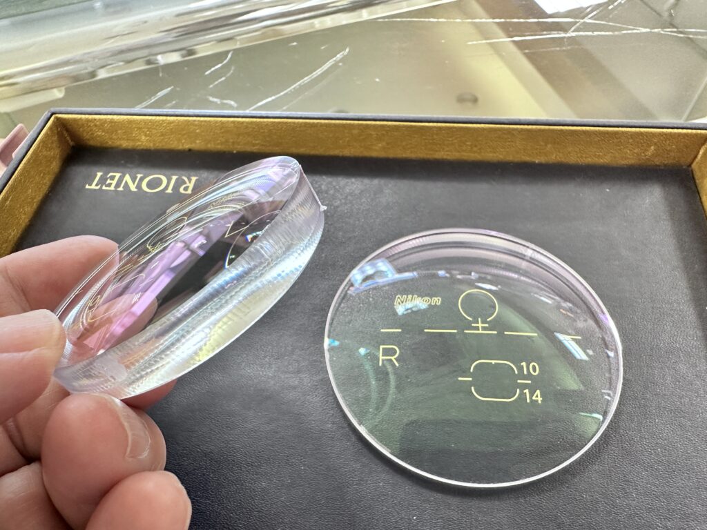 左目のレンズ、どうです?加工前の厚みとずいぶん変わるでしょ?