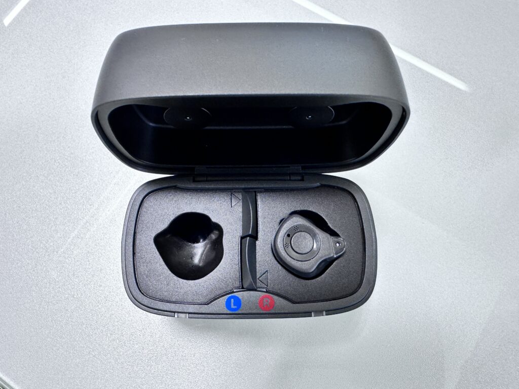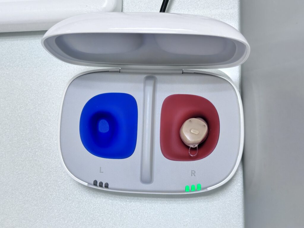 充電式補聴器の充電器。形状は各メーカーさん大体同じ。特に耳掛け式は本体を差し込むだけなのでそう大きく変わりません。