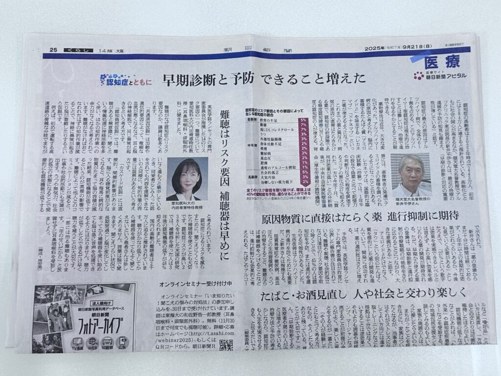 9月21日は世界アルツハイマーデーだそうです。我が家が取っている朝日、日経共に何だか認知症の話題が多いのでなんで?と思っていたら、この新聞を持って補聴器の相談に来られたお客様から教えていただきました。