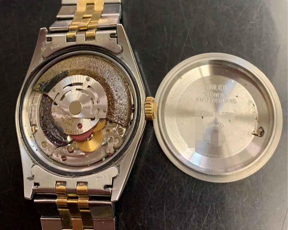 ロレックスは防水時計ですし、お預かりした時もリュウズロック(リュウズがネジ式になっていて隙間がなくなる仕様)もされていましたので、不思議でしたが、職人さんから帰って来た時に中の写真も同封されていました。