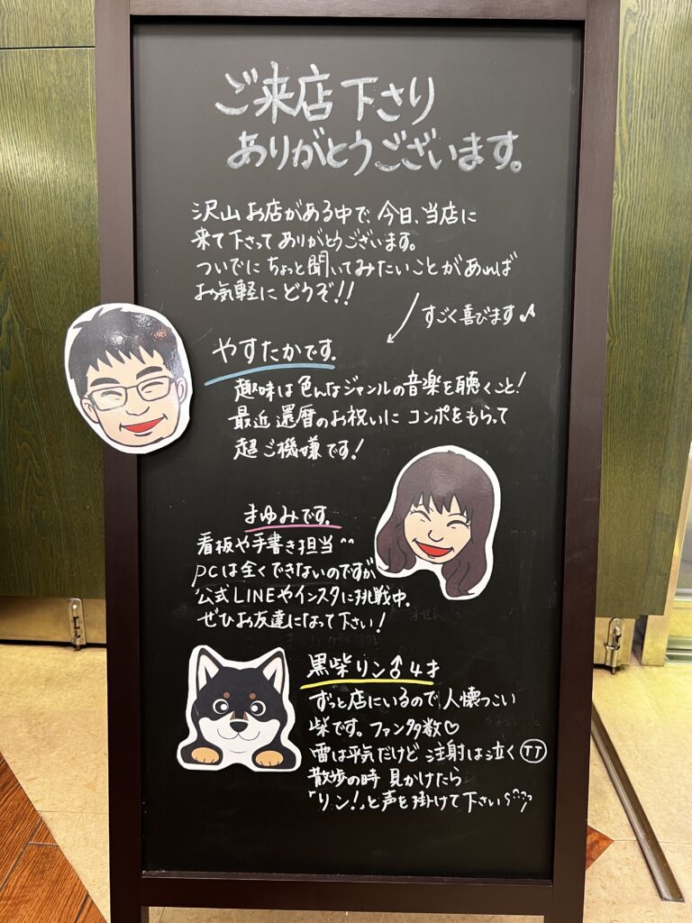 お店の入り口にあるブラックボード、実は私が毎日心を込めて書き換えています。 「今日は何を書こうかな?」と考える時間は、お客様への最初のご挨拶を考える時間。少しでも足を止めてくださる方の心が温かくなれば…そんな想いで筆を執っています。