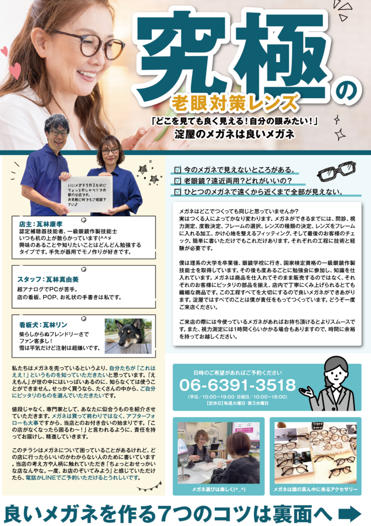 新大阪・東三国エリアで1958年から続く淀屋。夫婦二人のアットホームな雰囲気で、皆様の「一生モノの視界」をサポートいたします。